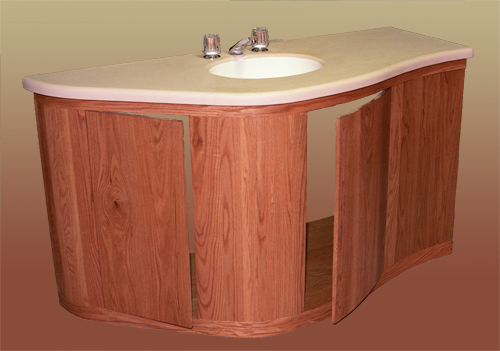 An experiment in curved cabinetry. A bent lamination was formed; these parts dictated the shape of the piece. The solid oak was joined together to follow the form. Oak plywood was shaped to match the form on the inside and attached to make the top and bottom of the cabinet.  |